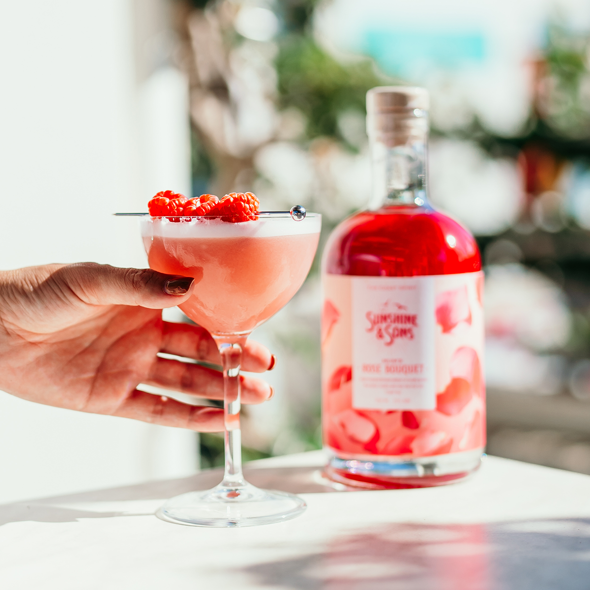 In a shaker add 50ml Mum's Rose Bouquet, 10ml Regal Rogue Darling Dry (or Vermouth), 30ml aquafaba, 20ml lemon Juice, 20ml raspberry syrup and shake well.