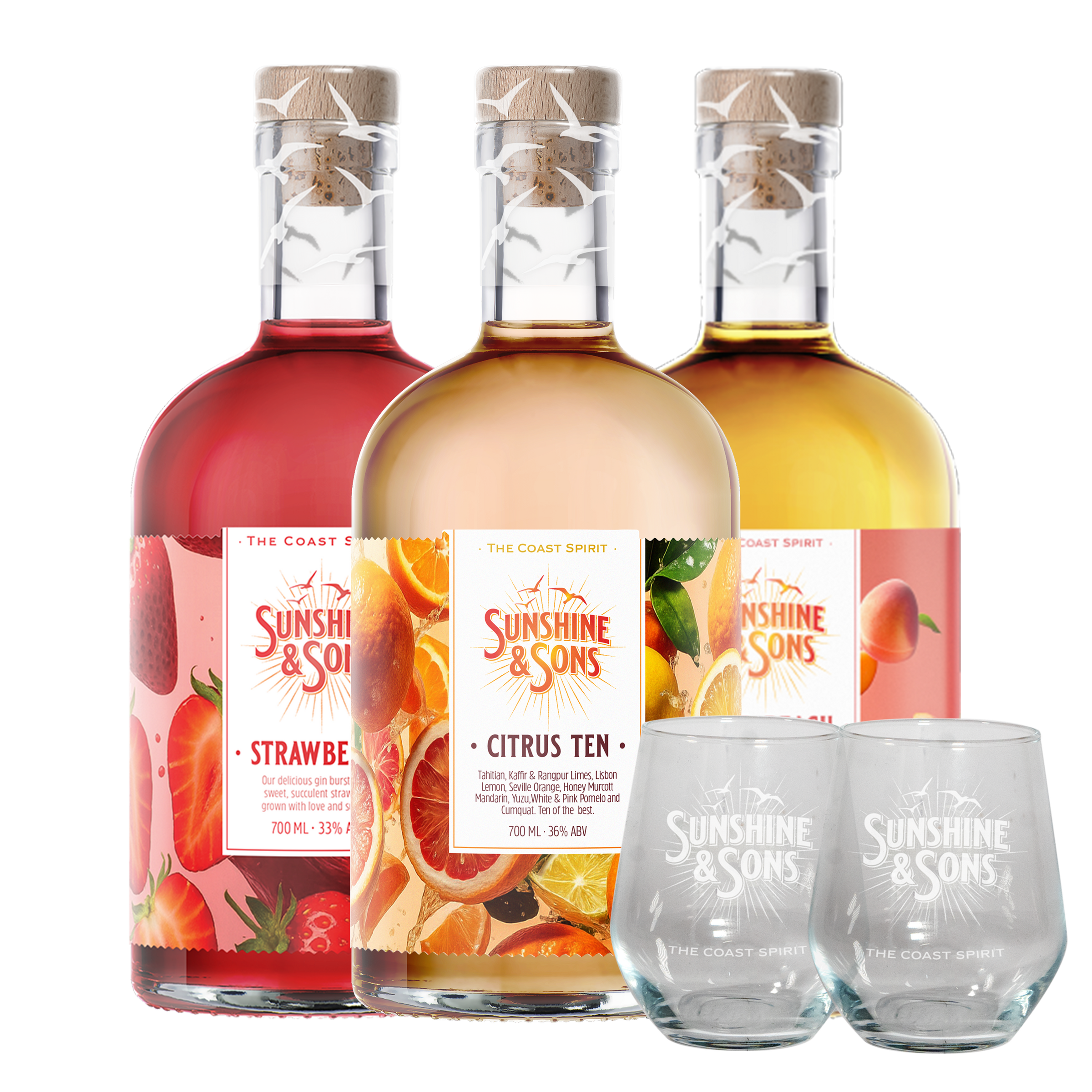 From the bright zest of Citrus Ten, bursting with ten of the world’s finest citrus fruits, to the sweet, sun ripened notes of Strawberry, and our Wild Peach Dry Gin. This bundle is pure Sunshine & Sons in a bottle.